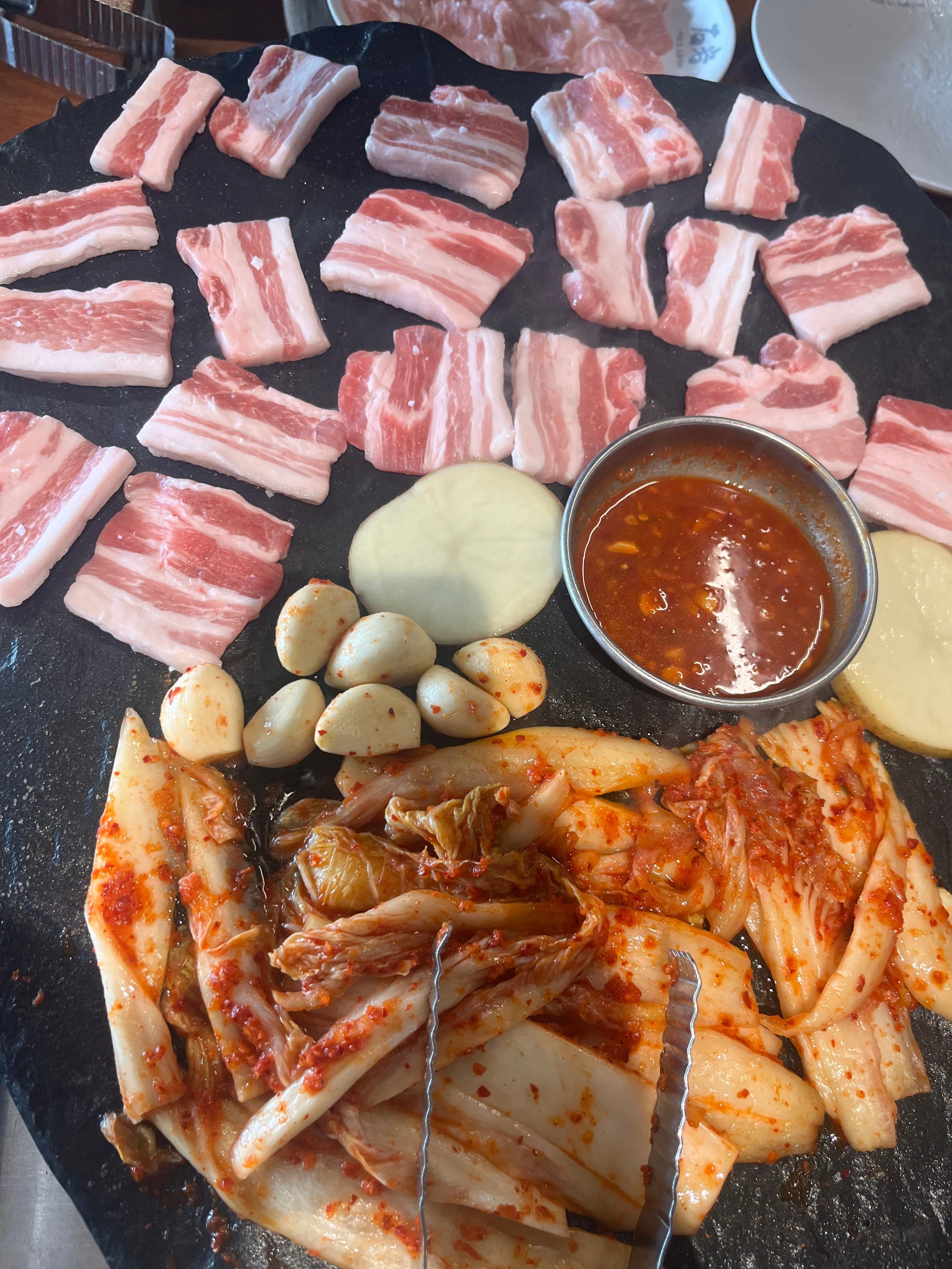 천겹이 뭐에요? 물어보니까 우리가 흔히 알고 있는 항정살이더라구요. 개인적으로 퍽퍽한 살보다는 기름기 있는 고기를 선호하는 편이라 저는 삼겹이 더 맛있었어요. 기본적으로 밑반찬이 깔리고 김치를 얹어줘요.