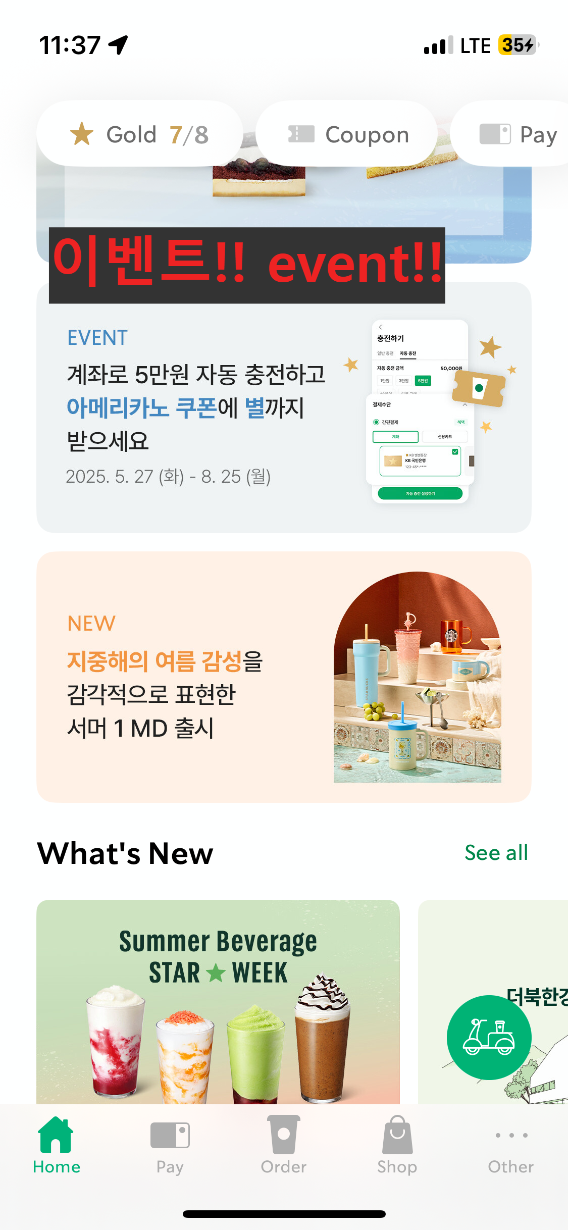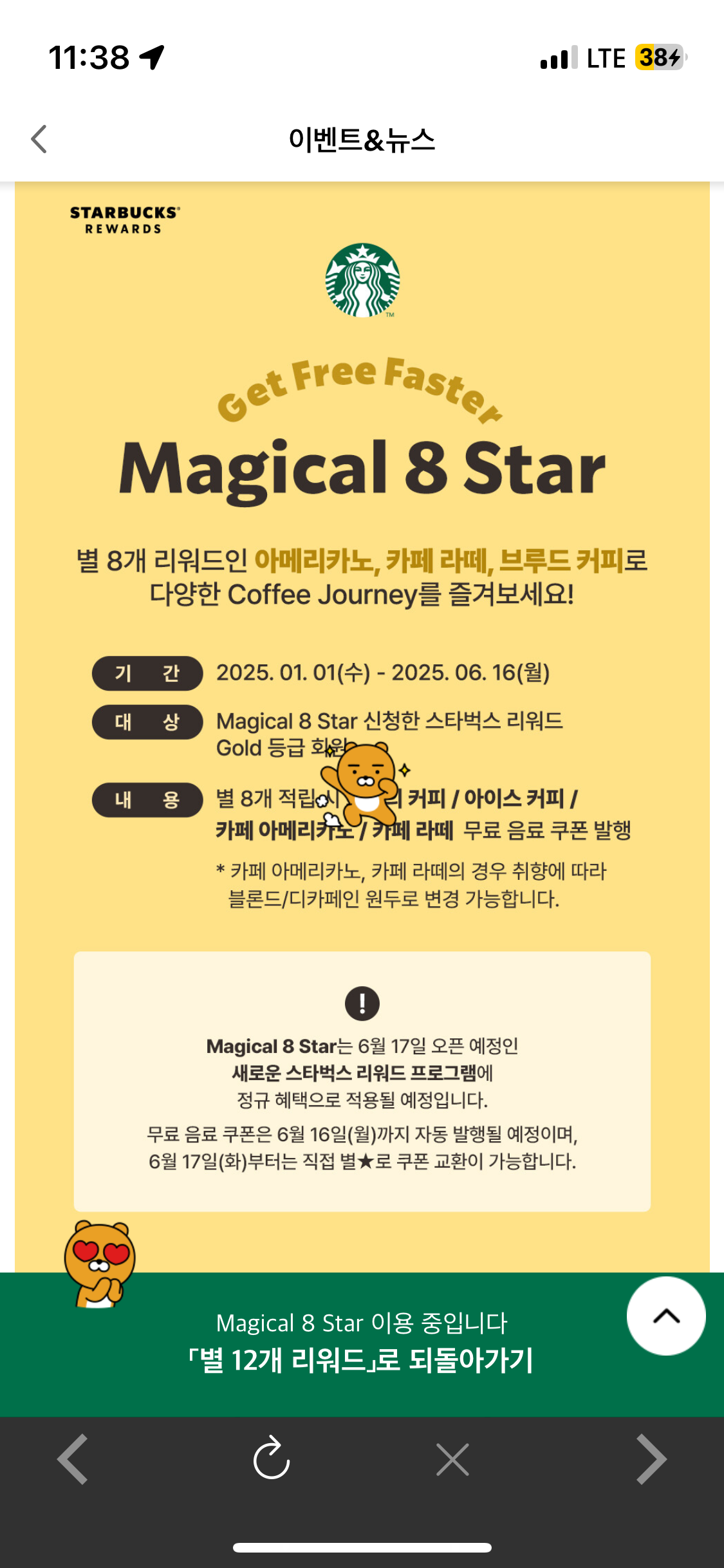 그래서 앱의 모든 카테고리와 배너를 하나씩 다 눌렀어요. 그러다 찾은 스타벅스 매지컬 8 스타 원래대로 돌리기!